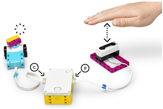 距離センサーモジュールをポートD、LモーターモジュールをポートCに接続します。
